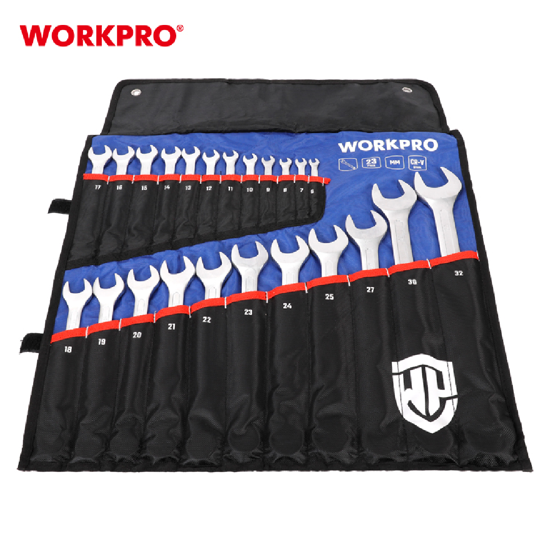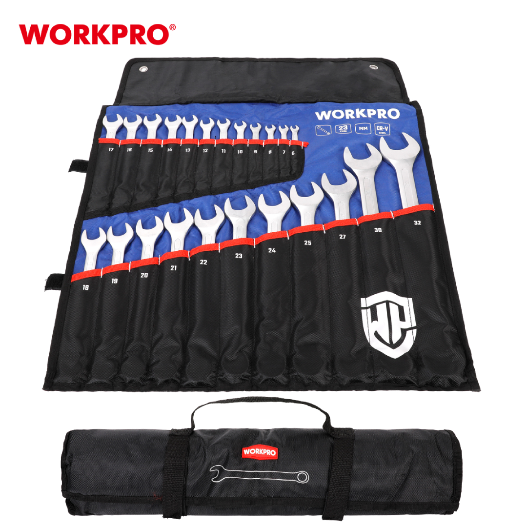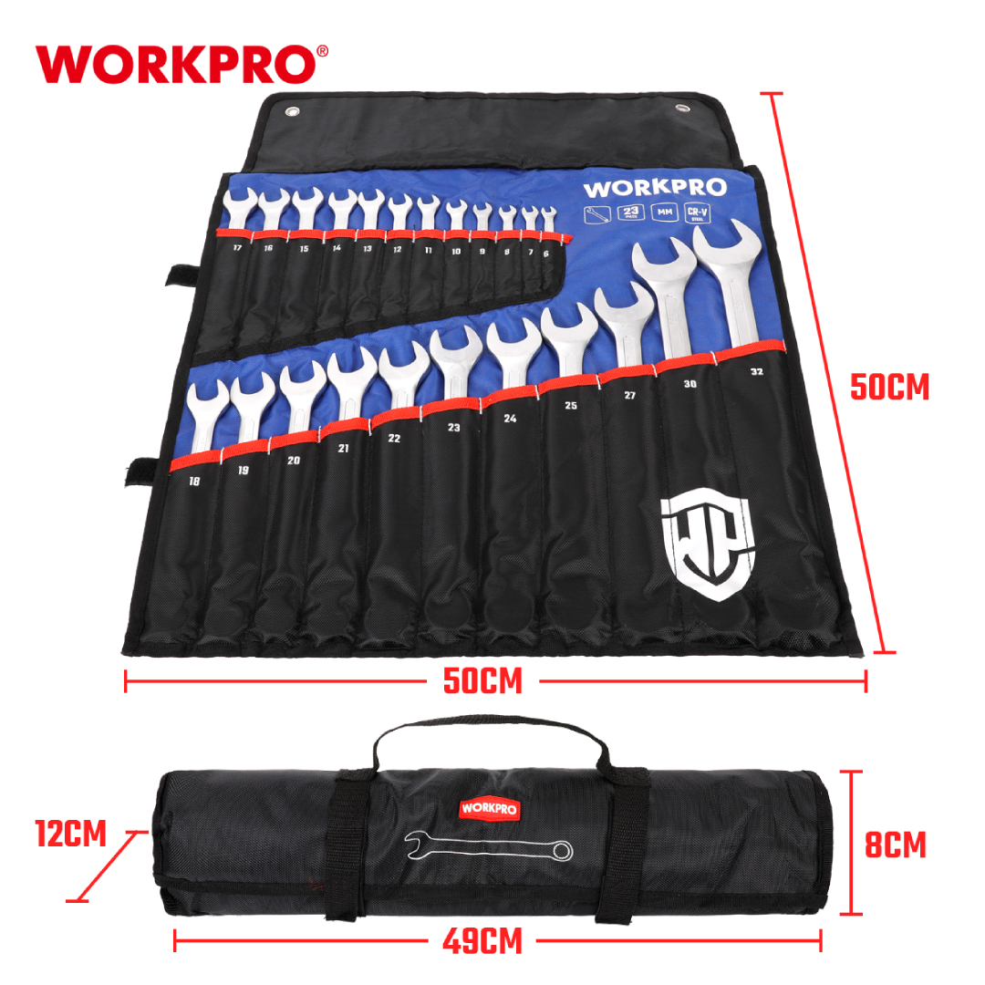 طقم شق رنق 23 قطعة من وورك برو WORKPRO WP202504 المكونة من 23 قطعة هي مجموعة شاملة من مفاتيح الربط عالية الجودة المصممة للمحترفين وهواة الأعمال اليدوية. كل مفتاح ربط مصنوع من فولاذ الكروم والفاناديوم، ومعالج بالحرارة لتعزيز القوة والمتانة، ويتميز بلمسة نهائية مطلية بالكروم ومطلية بالرمل لمقاومة التآكل. تتضمن المجموعة مجموعة واسعة من الأحجام المترية، مما يجعلها مناسبة لتطبيقات مختلفة، من إصلاحات المنزل إلى صيانة السيارات. يتم وضع مفاتيح الربط في حقيبة قابلة للطي لسهولة التخزين والحمل.