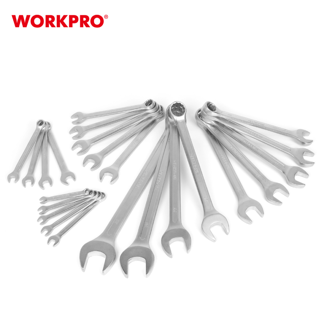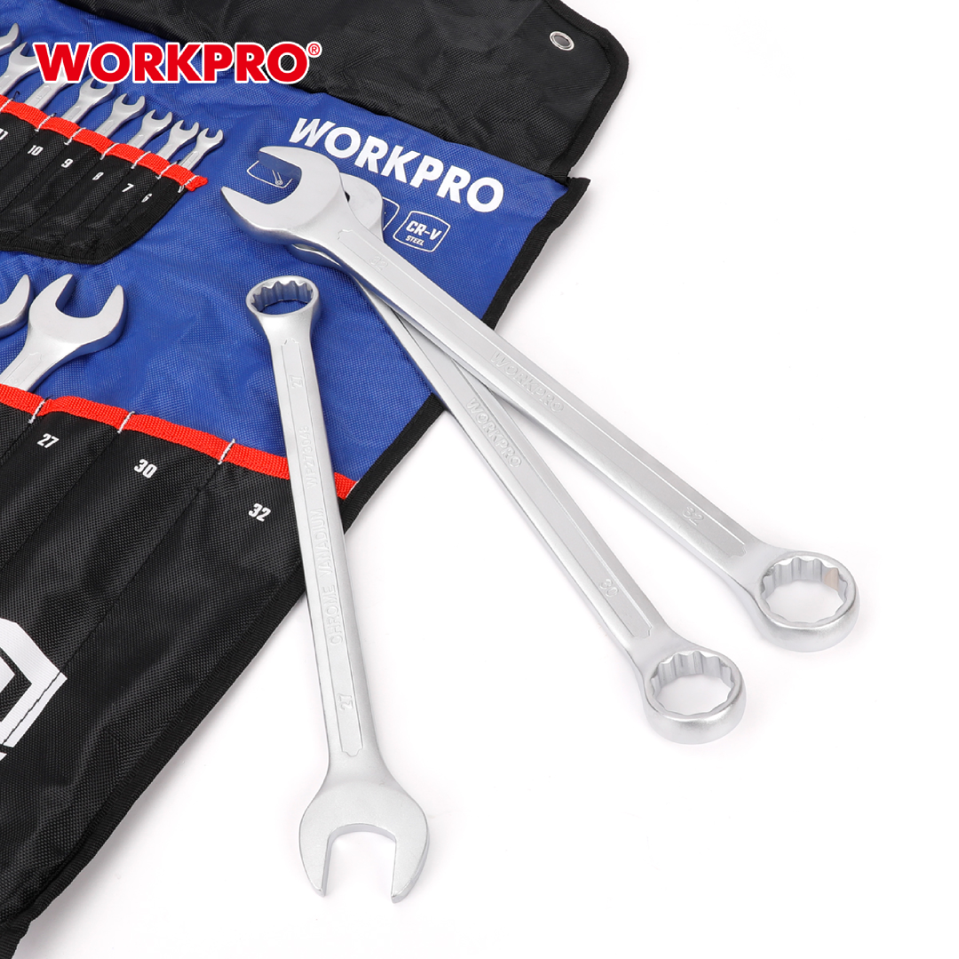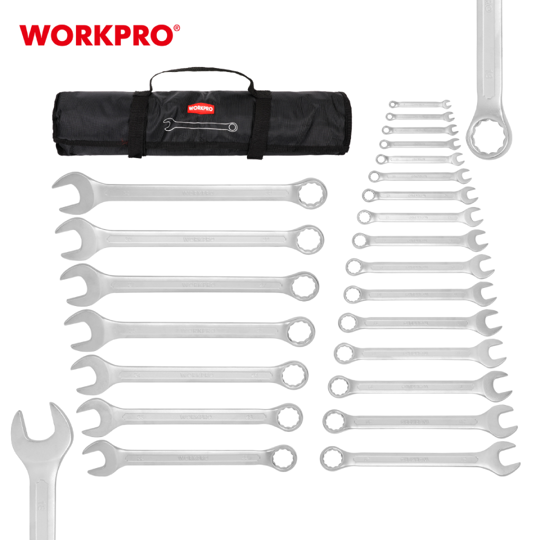 طقم شق رنق 23 قطعة من وورك برو WORKPRO WP202504 المكونة من 23 قطعة هي مجموعة شاملة من مفاتيح الربط عالية الجودة المصممة للمحترفين وهواة الأعمال اليدوية. كل مفتاح ربط مصنوع من فولاذ الكروم والفاناديوم، ومعالج بالحرارة لتعزيز القوة والمتانة، ويتميز بلمسة نهائية مطلية بالكروم ومطلية بالرمل لمقاومة التآكل. تتضمن المجموعة مجموعة واسعة من الأحجام المترية، مما يجعلها مناسبة لتطبيقات مختلفة، من إصلاحات المنزل إلى صيانة السيارات. يتم وضع مفاتيح الربط في حقيبة قابلة للطي لسهولة التخزين والحمل.