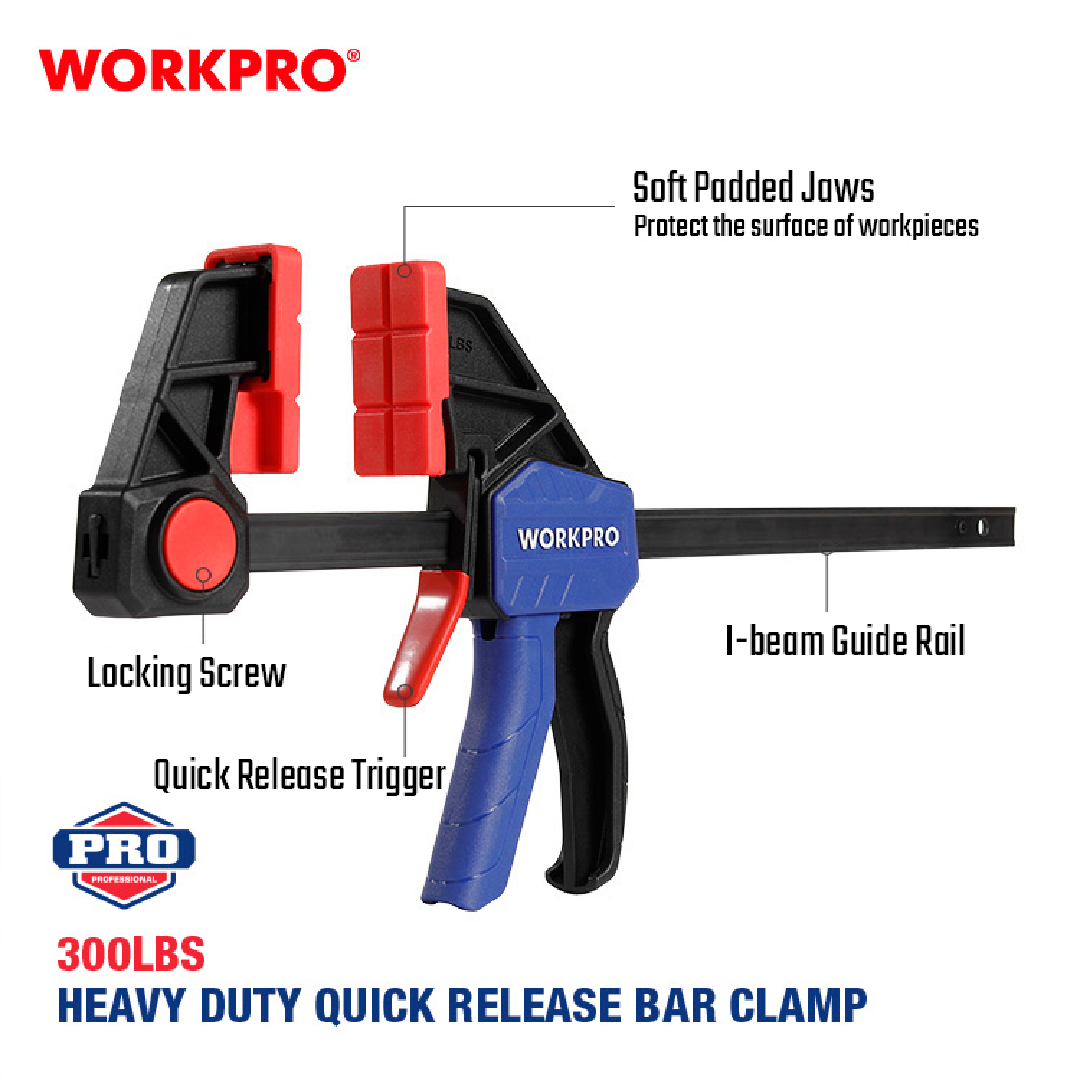 تم تصميم مشبك قضيب WORKPRO عالي التحمل سريع الفك مقاس 450 مم (18 بوصة) لمهام التثبيت القوية في مشاريع النجارة والتصنيع والتجميع. يوفر جسم النايلون المقوى وقضبان الفولاذ المقواة عالية الجودة مقاومة استثنائية للصدمات، مما يضمن المتانة أثناء الاستخدام المكثف. يوفر المشبك قوة تثبيت قوية تصل إلى 300 رطل، يتم تسهيلها من خلال آلية تثبيت معدنية للتشغيل الآمن والفعال. يسمح تصميم الزر السريع الفريد للمشبك بالتحول إلى ناشر دون الحاجة إلى أدوات إضافية، مما يعزز تنوعه. تحمي الوسادات غير القابلة للتلف والقابلة للإزالة والاستبدال ذات الملمس غير القابل للانزلاق أسطح قطعة العمل مع تعزيز قوة التثبيت الإجمالية. يتيح مزلاج التحرير السريع ضبط عرض القياس بسهولة، ويضمن المقبض المصمم هندسيًا قبضة مريحة أثناء الاستخدام لفترات طويلة.