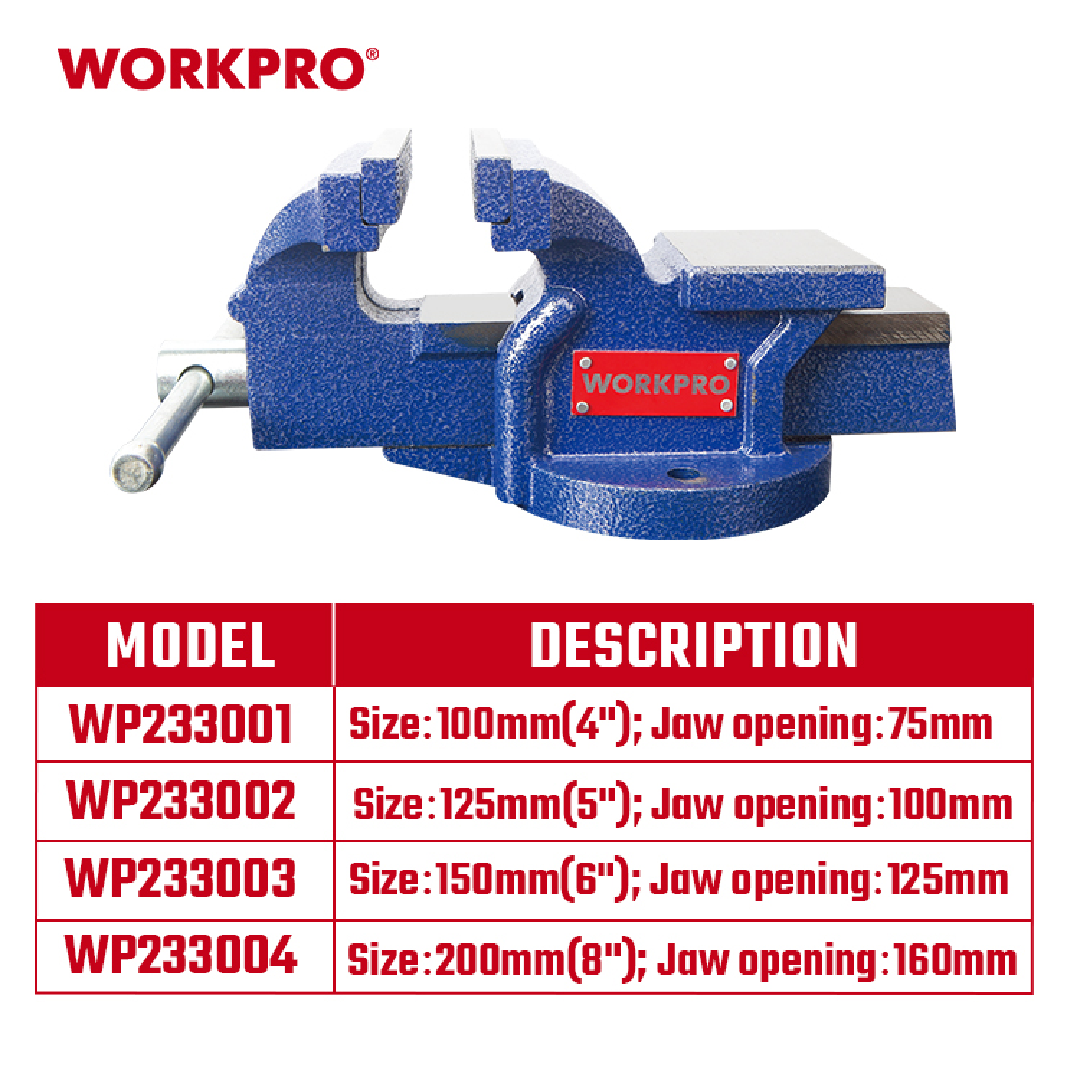 ملزمة تثبيت 5 انش 125ملم من وورك برو WorkPro (موديل WP233002) هي أداة متينة وموثوقة مصممة لتأمين قطع العمل أثناء مهام مختلفة مثل القطع والحفر والتجميع. تم تصنيع منضدة العمل هذه بقاعدة من الحديد المطاوع الثابت وسطح مطلي بالورنيش، وتضمن هذه المنضدة مقاس 5 بوصات (125مم) الثبات ومقاومة التآكل. توفر الفكين المقواة والمقسّاة قبضة قوية على المواد، مما يجعلها مناسبة لكل من تطبيقات النجارة والعمل المعدني.