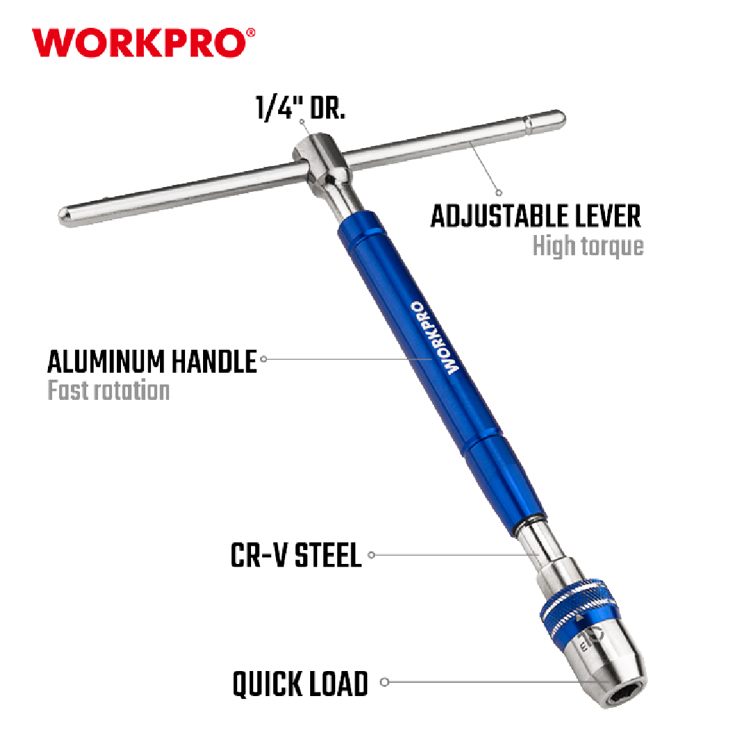 مفتاح T‑بار **WORKPRO WP275016** (١/٤″) مصمم لتوفير عزم سلس ودقيق في تطبيقات الإصلاح والتركيب. مصنوع من **فولاذ كروم‑فاناديوم متين** مع تشطيب كرومي مرآتي لمقاومة التآكل، ويتميز بمقبض من الألومنيوم لسهولة التدوير وسرعة الأداء. كما يحتوي على قضيب قابل للفصل لتعديل اتجاه العزم بسهولة.