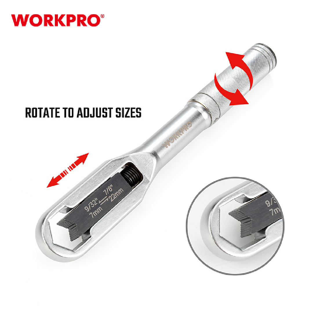 مفتاح براغي متعدد من 7-22ملم من وورك برو WORKPRO WP272015 هو مفتاح عالمي قابل للتعديل مصمم لاستيعاب مجموعة واسعة من أحجام المثبتات، سواء بالقياس المتري أو SAE. مصنوع من فولاذ الكروم الفاناديوم المطروق، ويوفر قوة ومتانة استثنائيتين. يضمن الطلاء المعالج بالحرارة والمطلي بالكروم مقاومة التآكل ويطيل عمر الأداة. يتميز المفتاح بفتحة فك قابلة للتعديل تتراوح من 7 مم إلى 22 مم (9/32 بوصة إلى 7/8 بوصة)، مما يجعله مناسبًا لتطبيقات مختلفة. يوفر المقبض المريح ذو القبضة المحببة الراحة ويمنع الانزلاق أثناء الاستخدام.