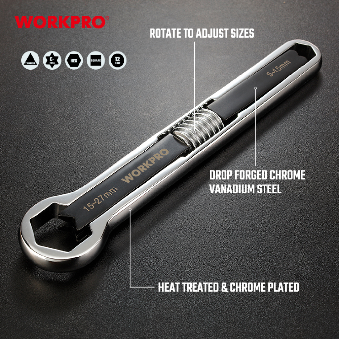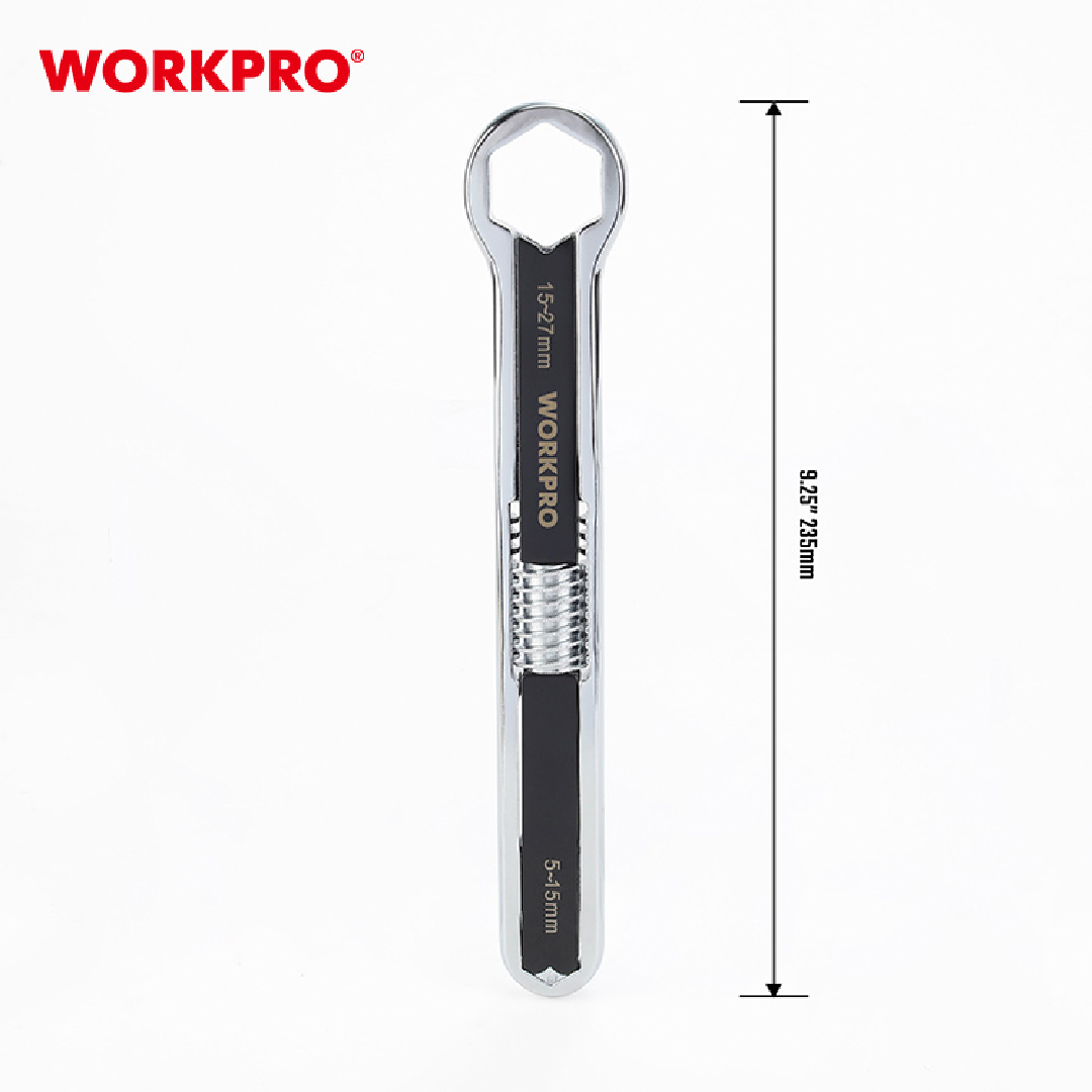مفتاح براغي متعدد من 5-27 ملم من وورك برو WORKPRO WP272016 هو مفتاح متعدد الاستخدامات مصمم لاستيعاب أدوات التثبيت بالمقاييس المترية وSAE. مصنوع من فولاذ الكروم الفاناديوم المطروق، ويوفر قوة ومتانة استثنائيتين. يضمن الطلاء المعالج بالحرارة والمطلي بالكروم مقاومة التآكل والتلف. يتميز هذا المفتاح بفكين قابلين للتعديل قادرين على التعامل مع أدوات التثبيت التي تتراوح من 5 مم إلى 27 مم، مما يجعله مناسبًا لمجموعة واسعة من التطبيقات.