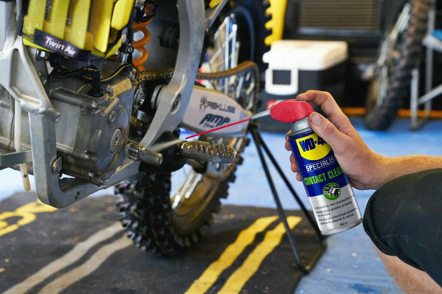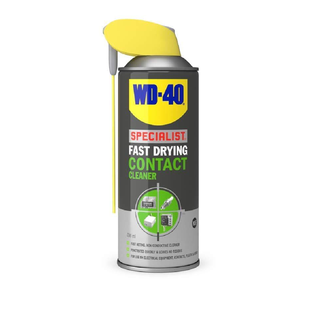 WD-40® Specialist Fast Drying Contact Cleaner هو بخّاخ تنظيف سريع الجفاف مخصّص للمكوّنات الكهربائية الحساسة. يتميز بتركيبة غير موصلة للكهرباء تعمل على إزالة الزيوت والأوساخ والغبار وبقايا الفلكس والرطوبة بفعالية، مع جفاف سريع دون ترك أي بقايا.
