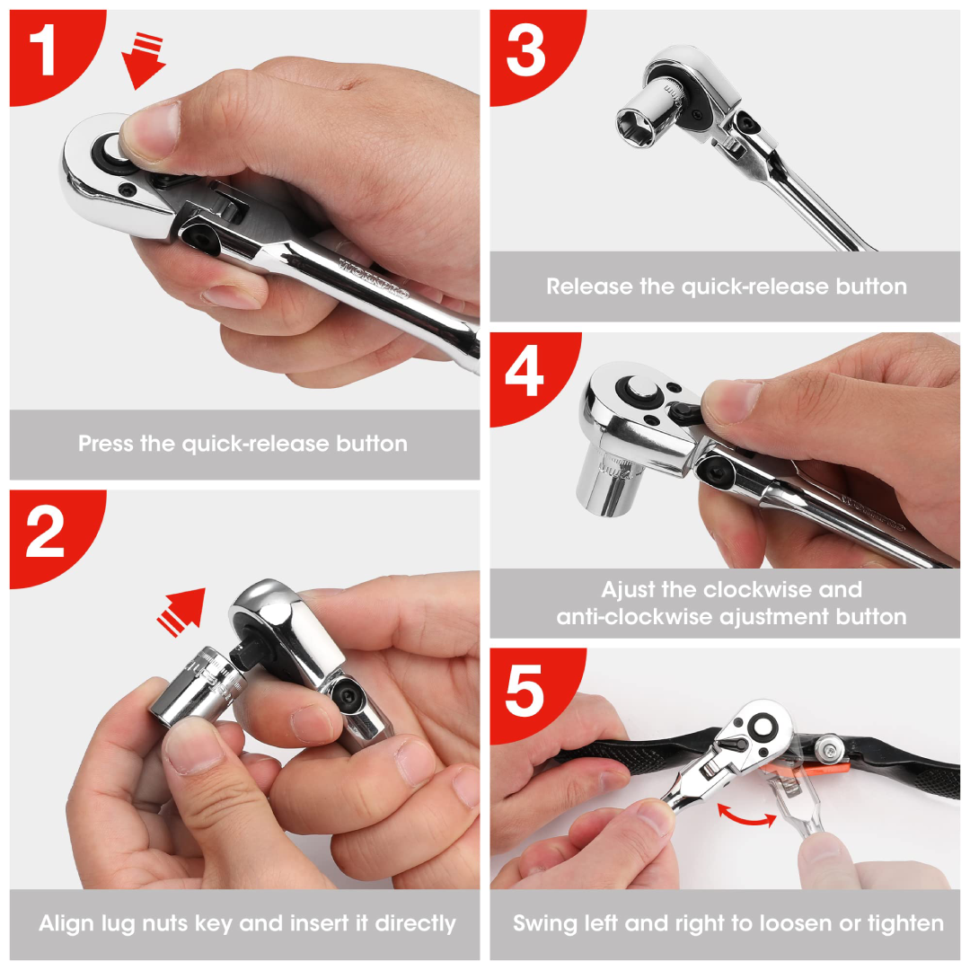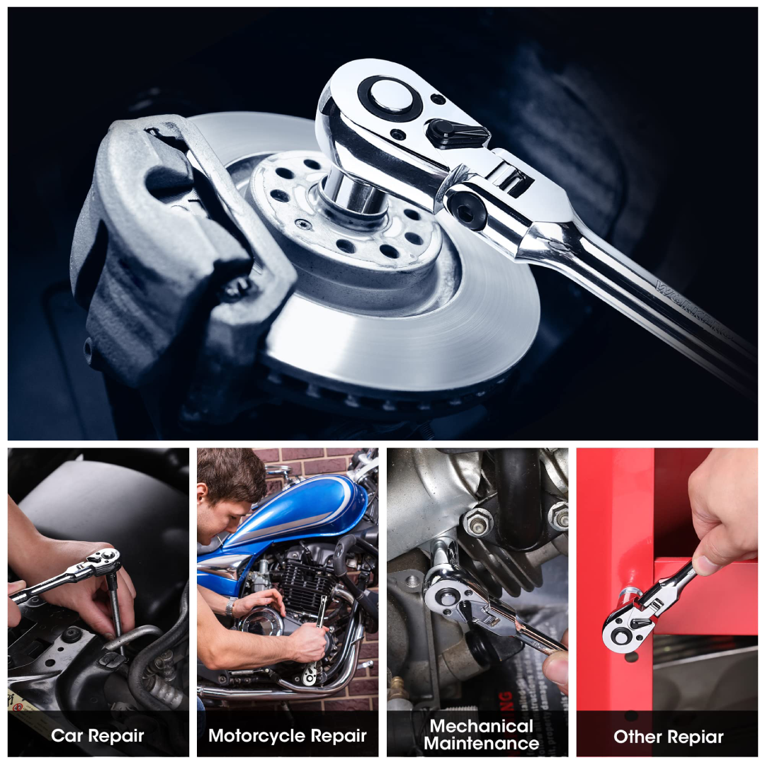 مقبض سقّاطة مرن من WORKPRO WP271029 بمقاس 1/2 بوصة (Drive) مع رأس قابل للدوران بزاوية تصل إلى 180°، ما يجعلها مثالية للوصول إلى الأماكن الضيقة والمعقدة. مصنوع من فولاذ كروم‑فاناديوم عالي الجودة، ويحتوي على آلية فك سريع مع سِقاطة بـ72 سن لتوفير تحكم دقيق وحركة سلسة أثناء التشغيل.