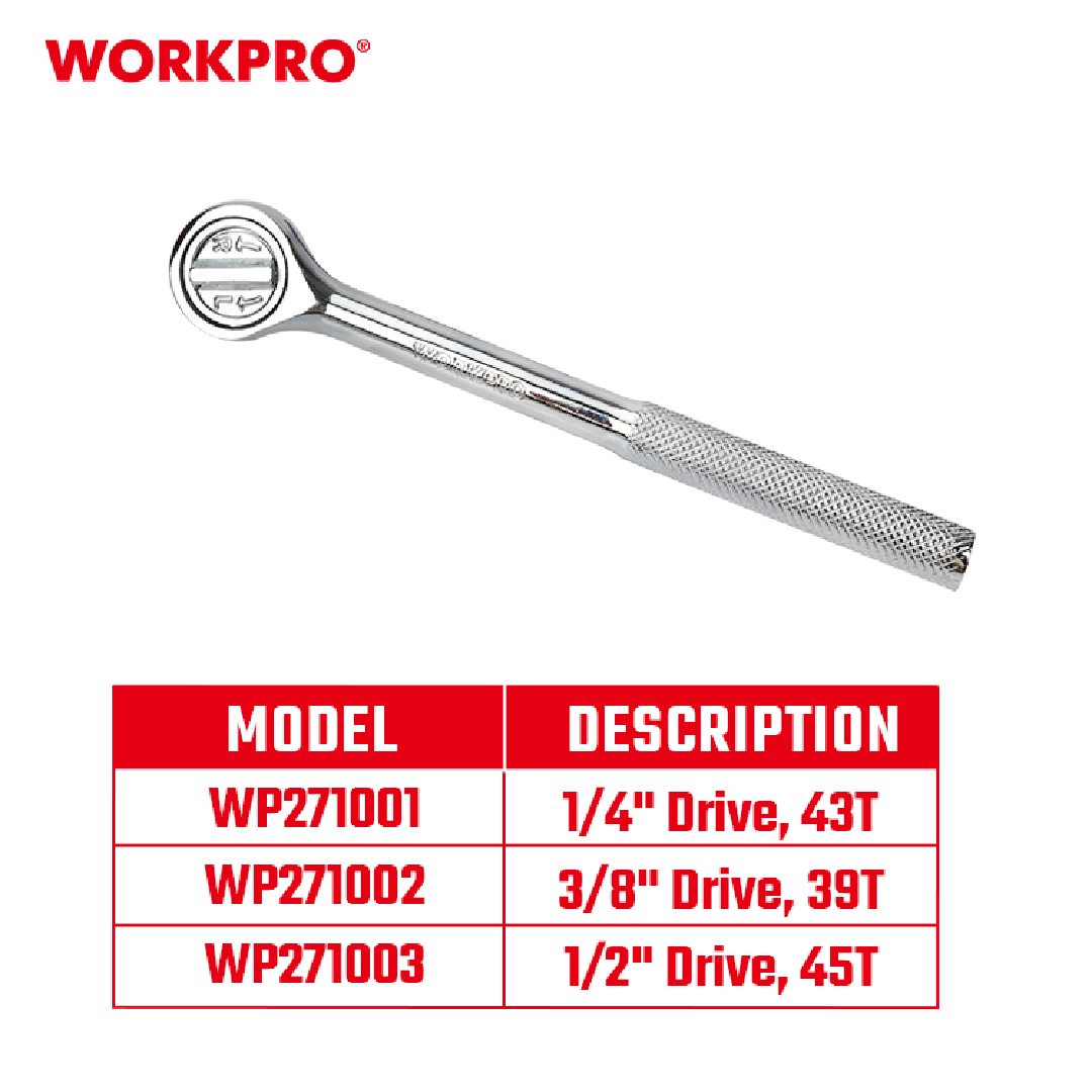 مقبض سقّاطة من WORKPRO WP271003 بمقاس 1/2 بوصة (Drive)، يتميز بآلية فك سريع وتصميم مريح لتوفير أداء فعال وسلس في أعمال الفك والربط. هذا المقبض مثالي للورش الصناعية، صيانة السيارات، أو الاستخدام المنزلي الاحترافي، حيث يجمع بين المتانة والراحة أثناء الاستخدام المتكرر.