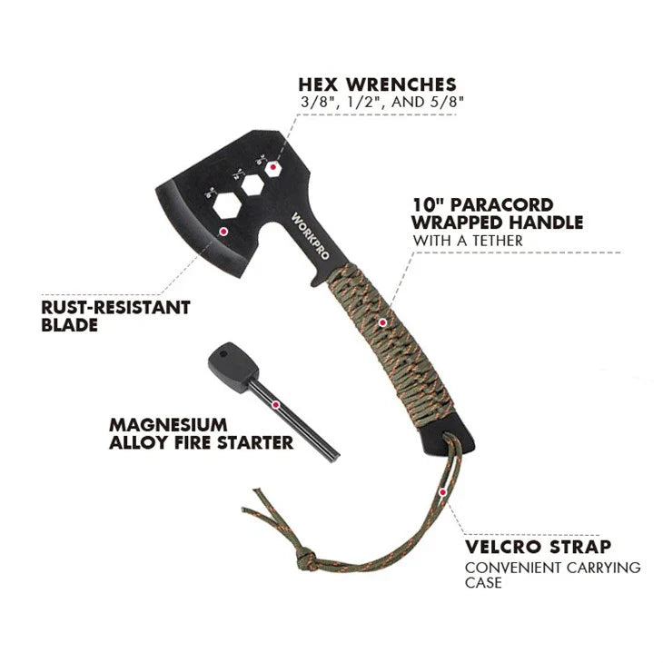 فأس WORKPRO مقاس 10 بوصات مصنوع من حبل باراكورد، وهو أداة متعددة الاستخدامات وصغيرة الحجم مصممة لعشاق الأنشطة الخارجية. يتميز بشفرة مقاومة للصدأ، ومقبض ملفوف بحبل باراكورد، ومشعل نار من سبائك المغنيسيوم، مما يجعله مثاليًا للتخييم والمشي لمسافات طويلة وحالات البقاء على قيد الحياة.