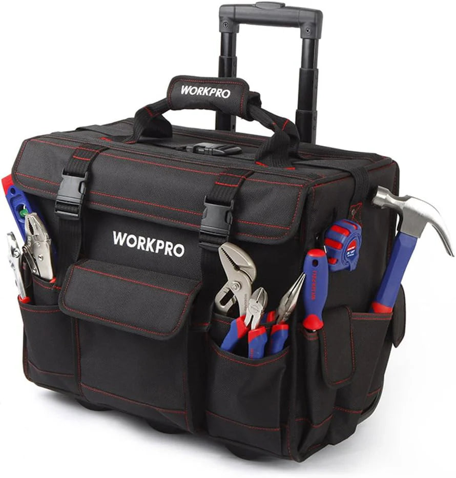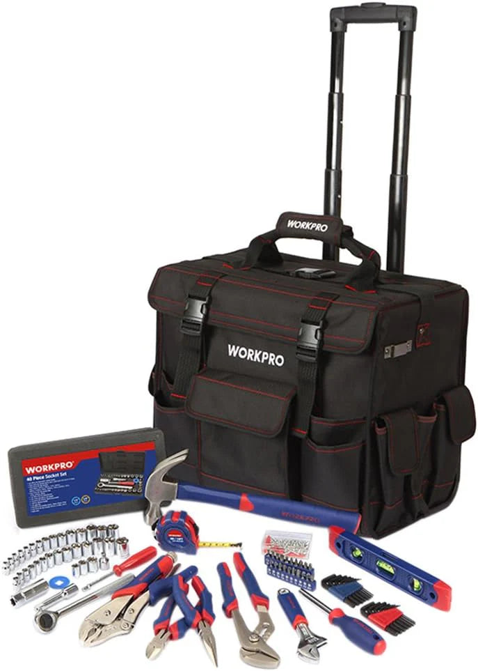 طقم أدوات مكوّن من ١٧٦ قطعة مصنوع من فولاذ كروم-فاناديوم، محفوظة ضمن حقيبة عربة متينة من قماش بوليستر ٦٠٠D بعجلات وقاعدة واقية، وتشمل مقابس، مطرقة، كماشات، مفكات، مفاتيح سداسية، ميزان، شريط قياس، رؤوس براغي، وإكسسوارات ضرورية—مناسب للمهنيين والهواة .