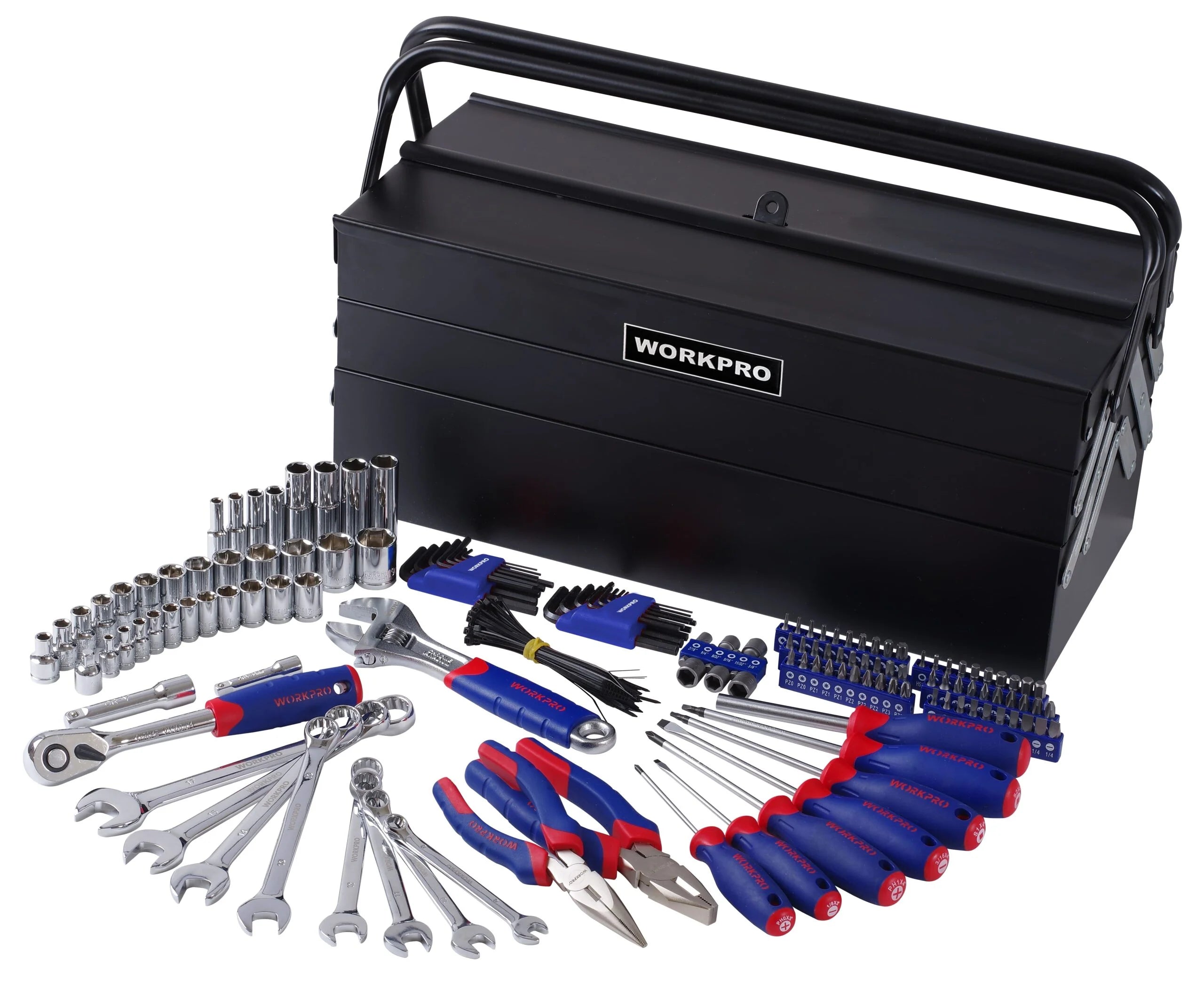 يشمل مفاتيح إنجليزية وسداسية (متري وإنجليزي)، مفتاح قابل للتعديل، كماشات (توليف وطويلة)، مفكات، وربطات كابل