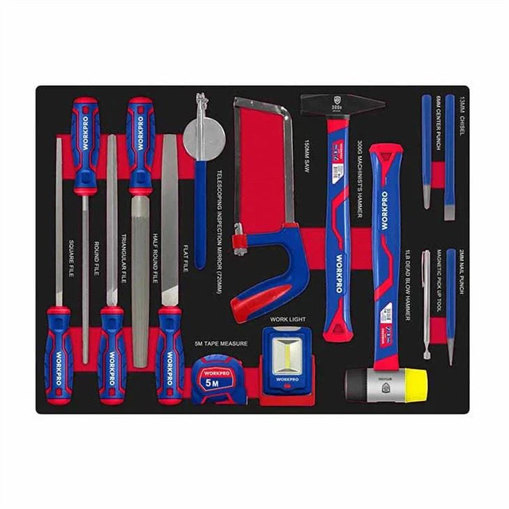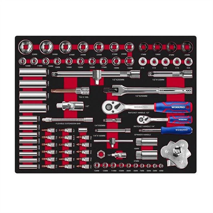 مجموعة أدوات WORKPRO WP209037 المكونة من 255 قطعة مصممة للمحترفين والهواة. تحتوي على مجموعة واسعة من الأدوات المخزنة في خزانة فولاذية متينة ذات 7 أدراج مع بطانات EVA، مما يوفر تخزينًا منظمًا وسهولة الوصول إلى الأدوات لمختلف التطبيقات.
