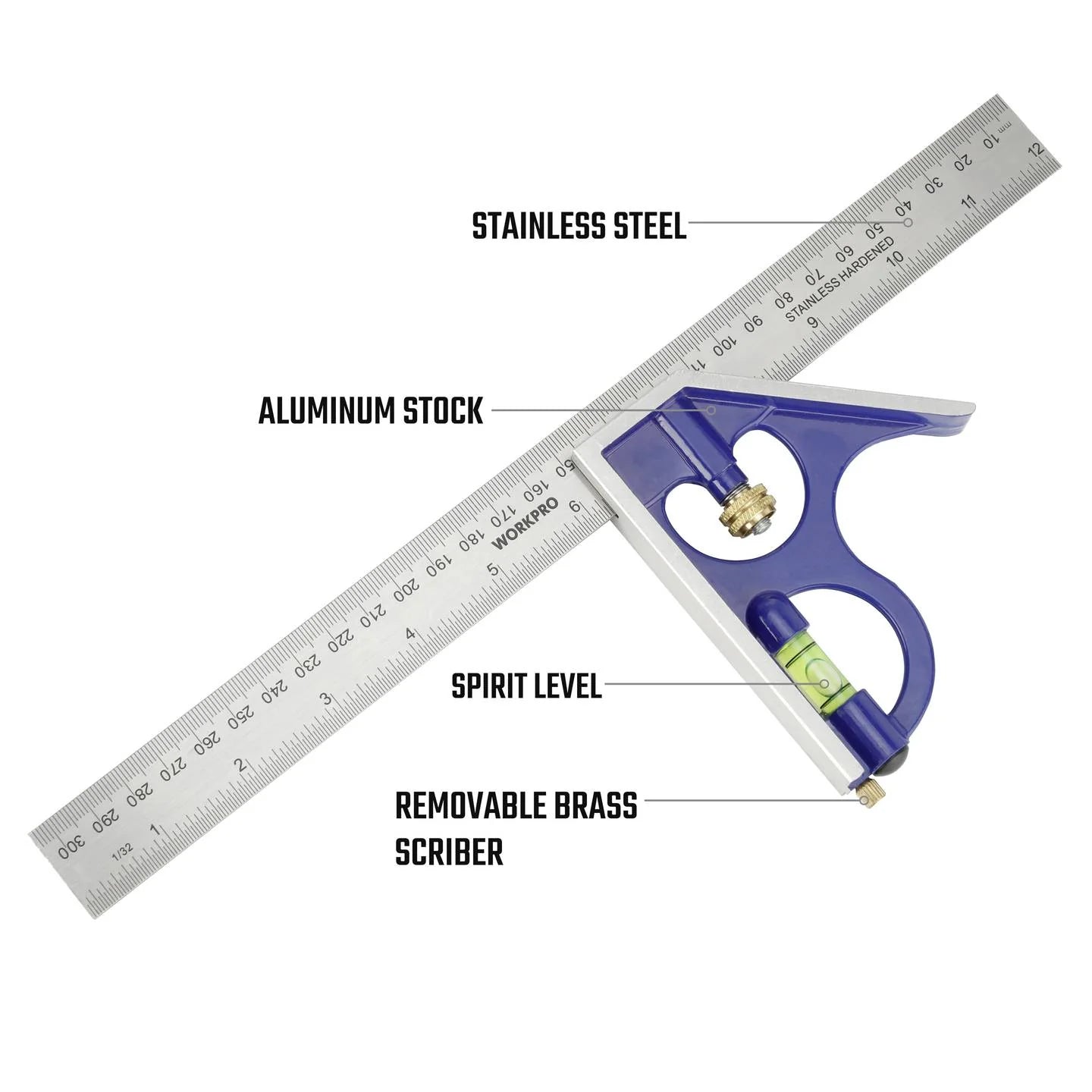 WORKPRO WP264002 هو زاوية علام مع ميزان ألمنيوم بقطر 300 مم (12 بوصة)، مُصمّم لمهام القياس والترميز الدقيقة. يتميز بقاعدة من الألومنيوم المصبوب بدقة عالية، وشفرة من الفولاذ المقاوم للصدأ محفورة بتدرجات متعددة، ومخرطة نحاسية قابلة للإزالة، وقارورة أكريليك مقاومة للصدمات لقياسات دقيقة للزوايا.