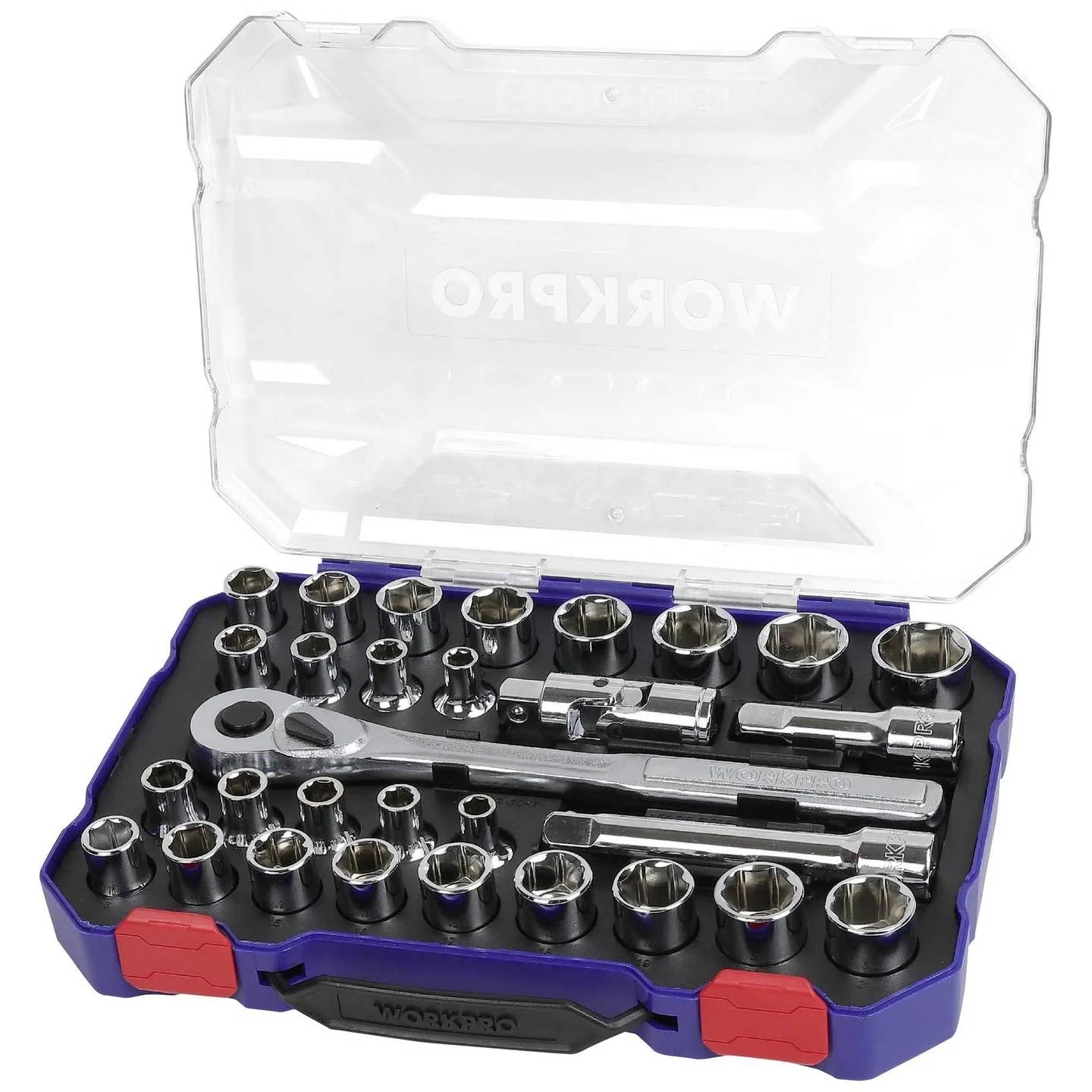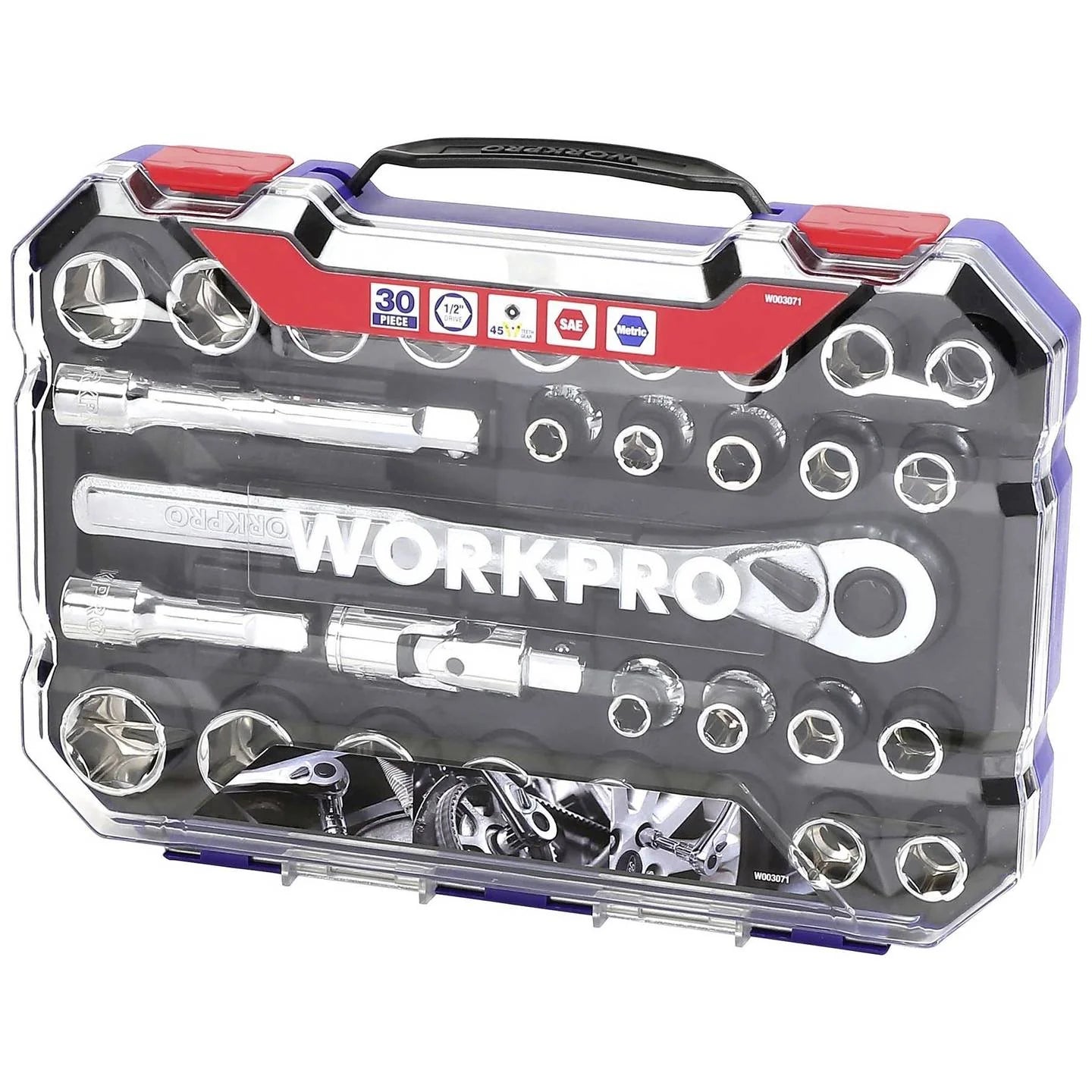 طقم بوكسات WORKPRO المكونة من 30 قطعة بقياس 1/2 بوصة هي مجموعة أدوات شاملة مصممة للمحترفين وهواة الأعمال اليدوية. مصنوعة من فولاذ الكروم فاناديوم (CR-V) المتين، مما يضمن القوة وطول العمر. تتضمن مجموعة واسعة من المقابس بقياسات SAE ومترية، ومفصل عالمي، وأشرطة تمديد، ومقبض نقرة سريع التحرير، جميعها محفوظة في حقيبة قوية مصبوبة بالنفخ لتخزين منظم وسهولة الحمل.