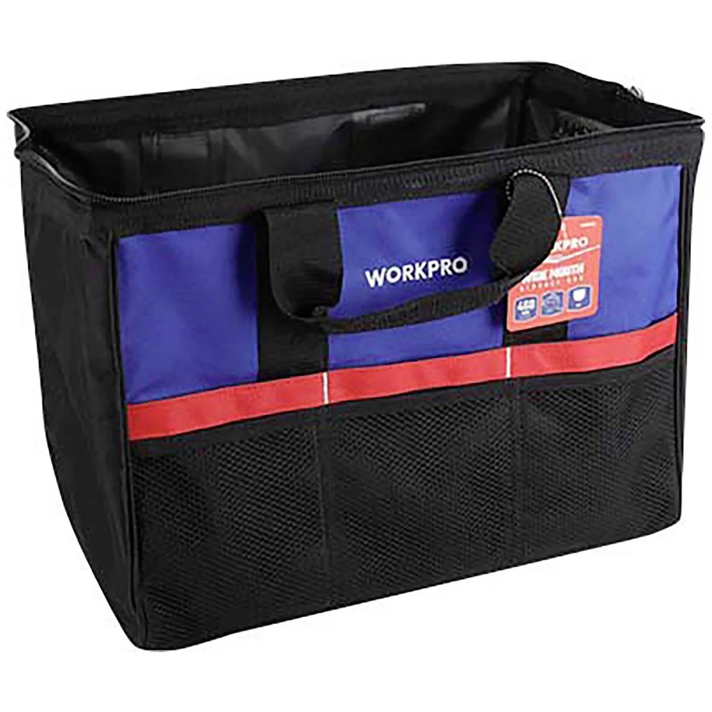 حقيبة WORKPRO WP281002 بسعة 18 بوصة (445 مم) مصممة للمحترفين والهواة. مصنوعة من بوليستر 500D المتين، توفر مقصورة رئيسية واسعة مع فتحة علوية واسعة للوصول السهل إلى الأدوات. تتميز الحقيبة بجيوب متعددة للتخزين المنظم وحزام كتف قابل للتعديل لحمل مريح.