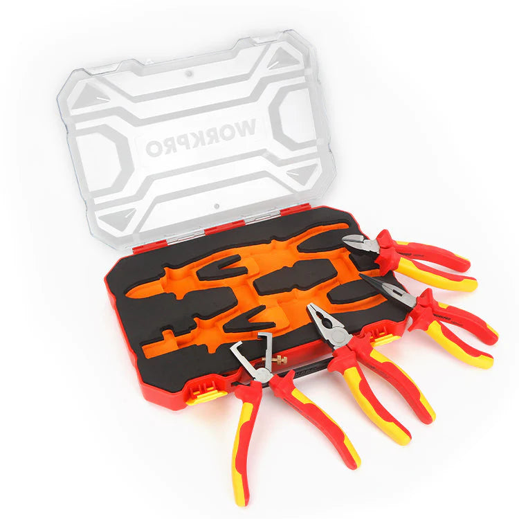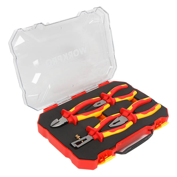صُممت مجموعة زراديات WORKPRO WP204703 المعزولة المكونة من 4 قطع للمحترفين الذين يعملون مع الدوائر الكهربائية النشطة. كل كماشة حاصلة على شهادة VDE، وخضعت لاختبارات فردية عند 10,000 فولت تيار متردد، ومعتمدة للتشغيل الآمن حتى 1,000 فولت تيار متردد. تتضمن المجموعة أربع كماشات أساسية، جميعها مصنوعة من فولاذ الكروم الفاناديوم المتين، وتتميز بمقابض مريحة ثنائية المكونات لتوفير الراحة والتحكم.