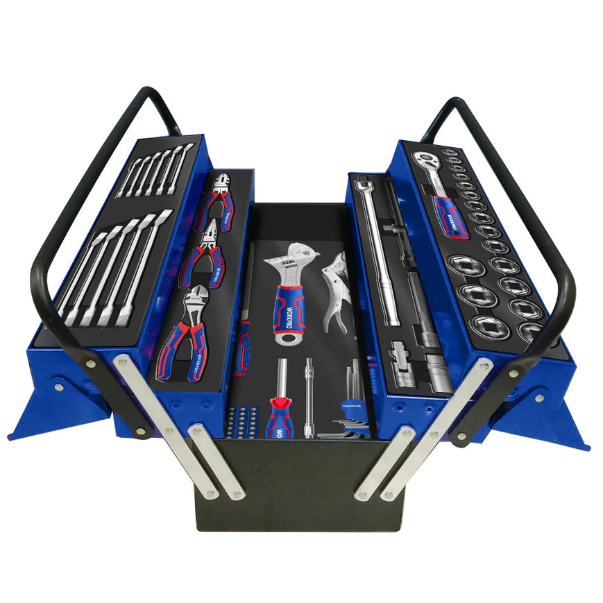مجموعة أدوات احترافية تتضمن 93 أداة أساسية من فولاذ CR‑V، مرتبة داخل صندوق كانتيليفر بخمسة طبقات—مثالية للسيارات، الأعمال المنزلية، والورش .