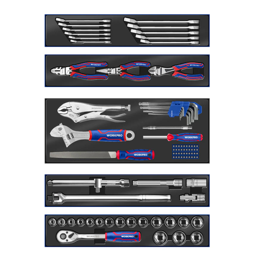 9 مفاتيح سداسية (1.5‑10 مم)، مفتاح إنجليزي قابل للتعديل 10″، كماشة قفل 10″، مبرد نصف دائري 8″